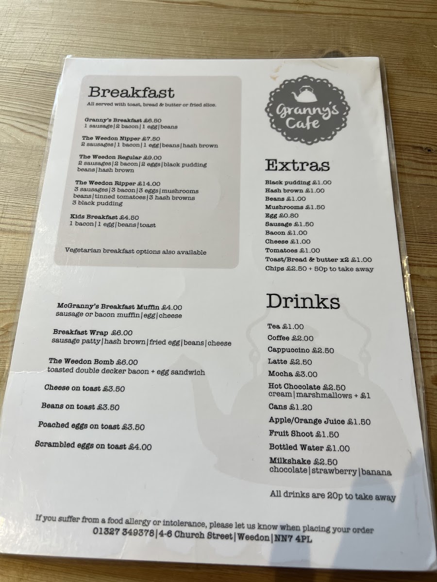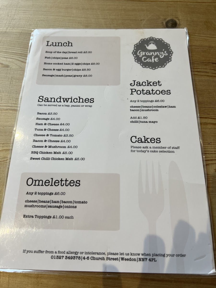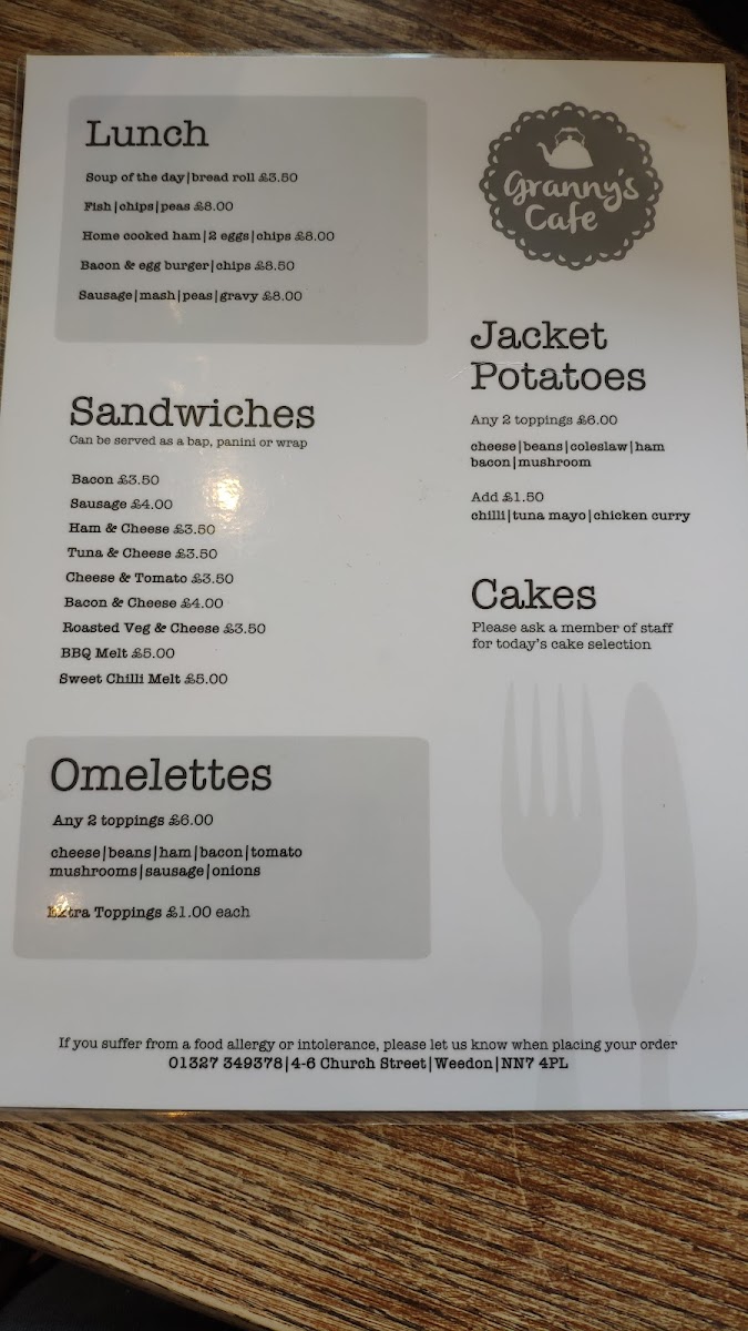 Welcome to Granny's Cafe, a charming eatery nestled in Weedon Bec, Northampton. Known for its homely atmosphere, Granny's Cafe offers a delightful menu that showcases a mix of comforting classics and sweet treats. Start your day with a hearty breakfast, featuring their renowned "Weedon Ripper," or opt for the enticing soup of the day with a fresh bread roll. For those with a sweet tooth, the selection of cakes, including the rich Victoria sponge and the indulgent millionaire’s shortbread, will surely satisfy.